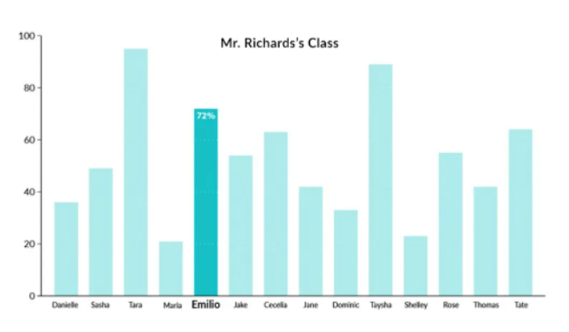 Fifth grade teacher Mr. Richards sees that Emilio has a national percentile rank of 72 and that he is performing above most of his peers nationwide.