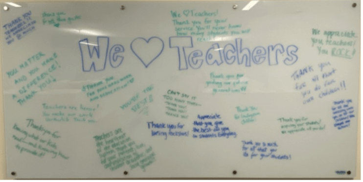 Our company was created to support you and your students, and we are deeply grateful for everything you do. On our “We Love Teachers” whiteboard, our team members share their appreciation for all the teachers who shaped their lives—who saw something in them they didn’t see in themselves. Their very own Mrs. Guidoboni. Our teacher appreciation wall is a reminder of the incomparable and transformative impact you have on children’s lives.
