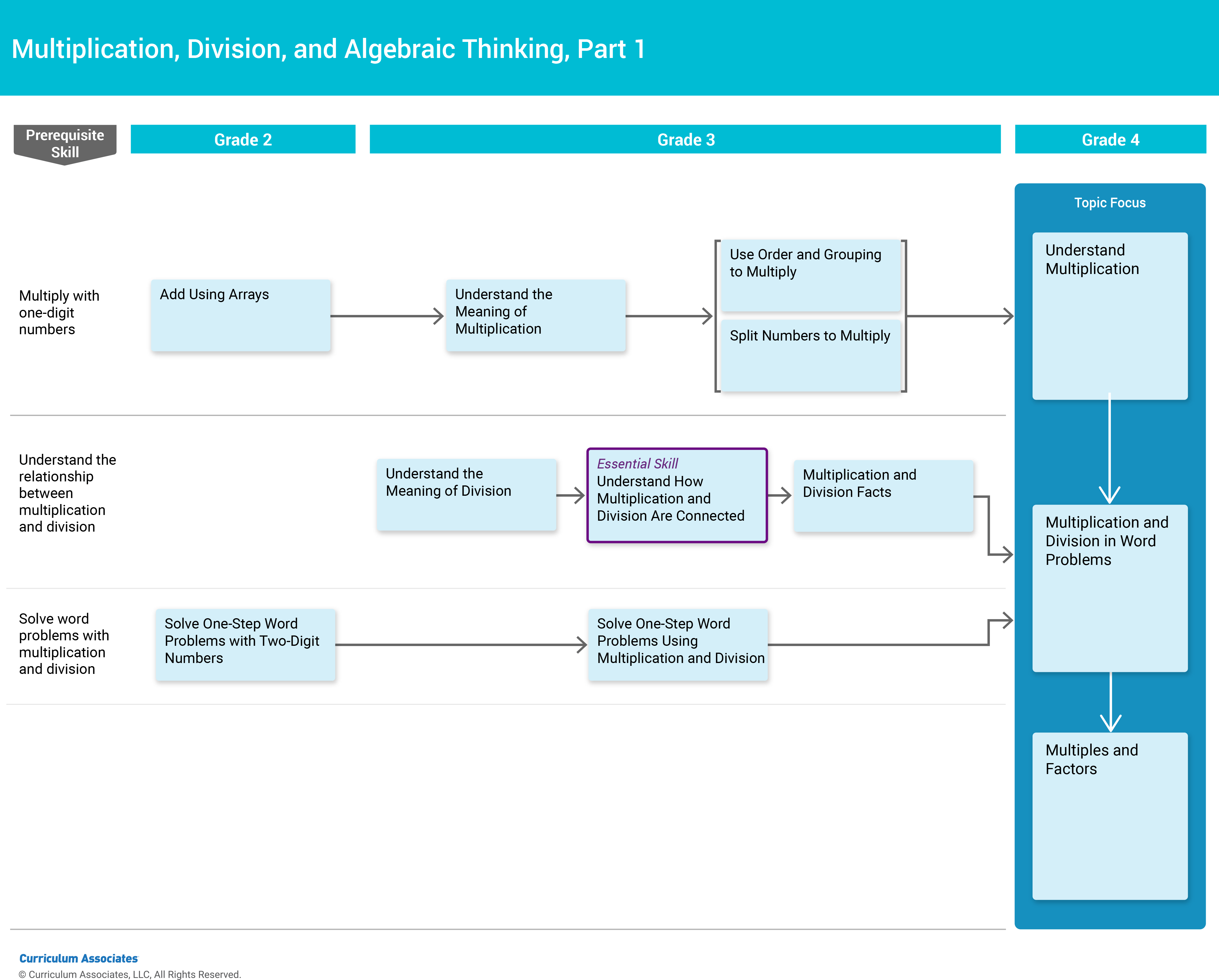 The chart below shows how fourth grade skills build on concepts learned in earlier grades. To be successful in the lesson Multiply by Two-Digit Numbers, students need to do well on previously taught Grades 2–4 skills. By tracing a standard back to its logical roots, you can see how the concepts you’re teaching now were addressed in preceding standards. It also helps you identify any content limits, such as what numbers or models your students used in previously learned standards. From this, you can flesh out places to integrate those prerequisites to support what you’re teaching.