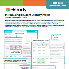 Available at the end of the 2025 calendar year, educators will now be able to view literacy data from across i-Ready in a single report. This report includes Overall Diagnostic and Diagnostic Domain data, Literacy Tasks, and Early Literacy/Dyslexia Screening in one view. It was built for both educators and family members, with easy-to-understand language as well as guidance on how to read the report, what everything means, suggested next steps to take at home, and links to the i-Ready Family Center for more detailed information.