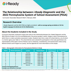i-Ready Diagnostic and the 2022 PSSA are highly correlated–with an average spring correlation of .81 for English Language Arts (ELA) and .81 for Mathematics.